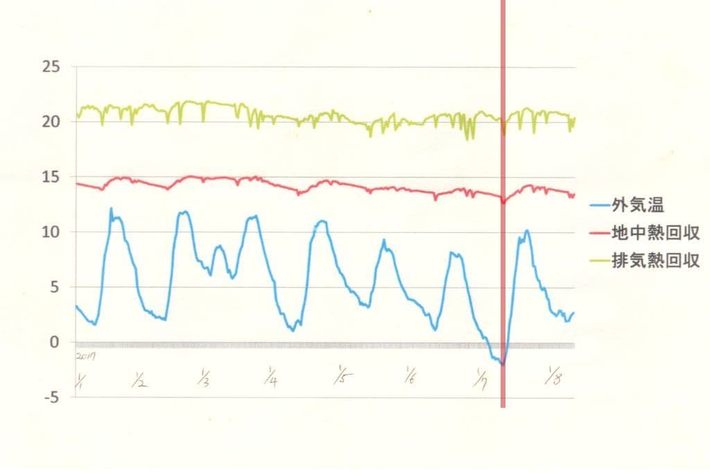 外気温は大きく湾曲していますが、パッシブデザインの成果でかなりの部分抑えられ